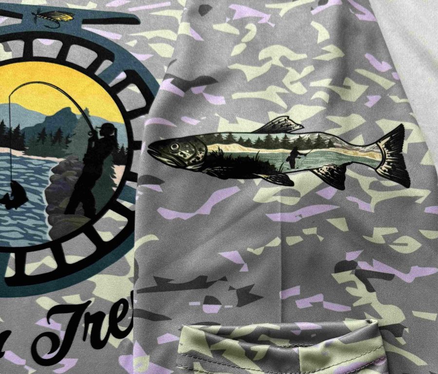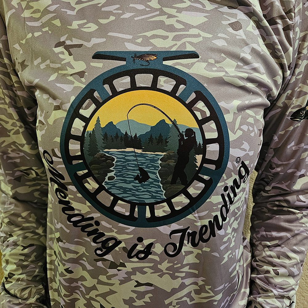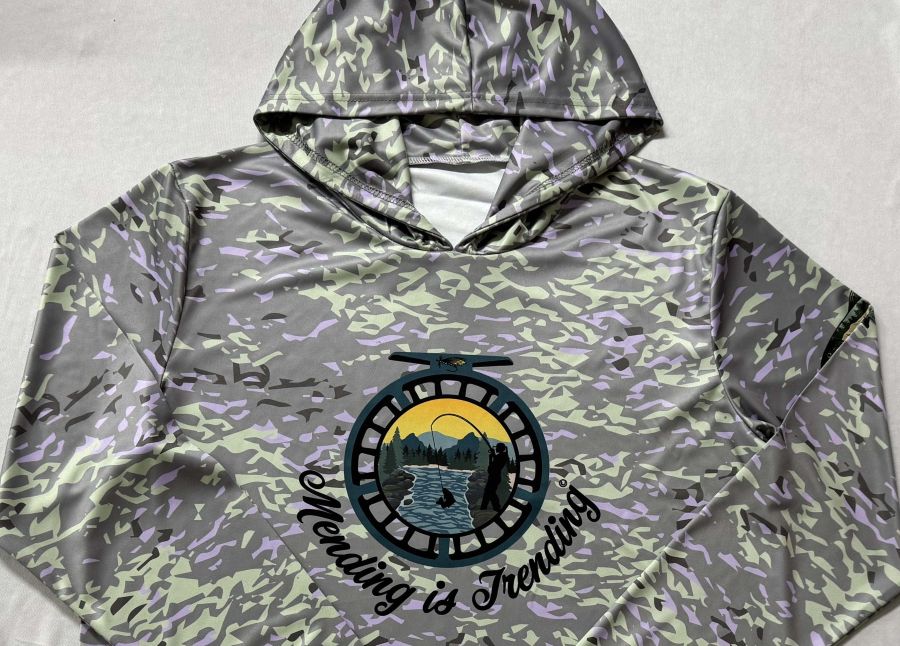 NEW PRODUCT ALERT! 100% poly tech sun shirt hoodie with thumb holes to protect hands, front fly reel design sublimated and right sleeve logo; Our First “Women’s CAMO”, with light purple and light green, for that just right “feminine but fierce look”. NEW Mending is Trending design in the middle front of garment, and our trout logo on the right sleeve. Thumb holes to prevent sun damage on long days of catching fish. Sizes small – 2X, unisex sizing. Runs small.