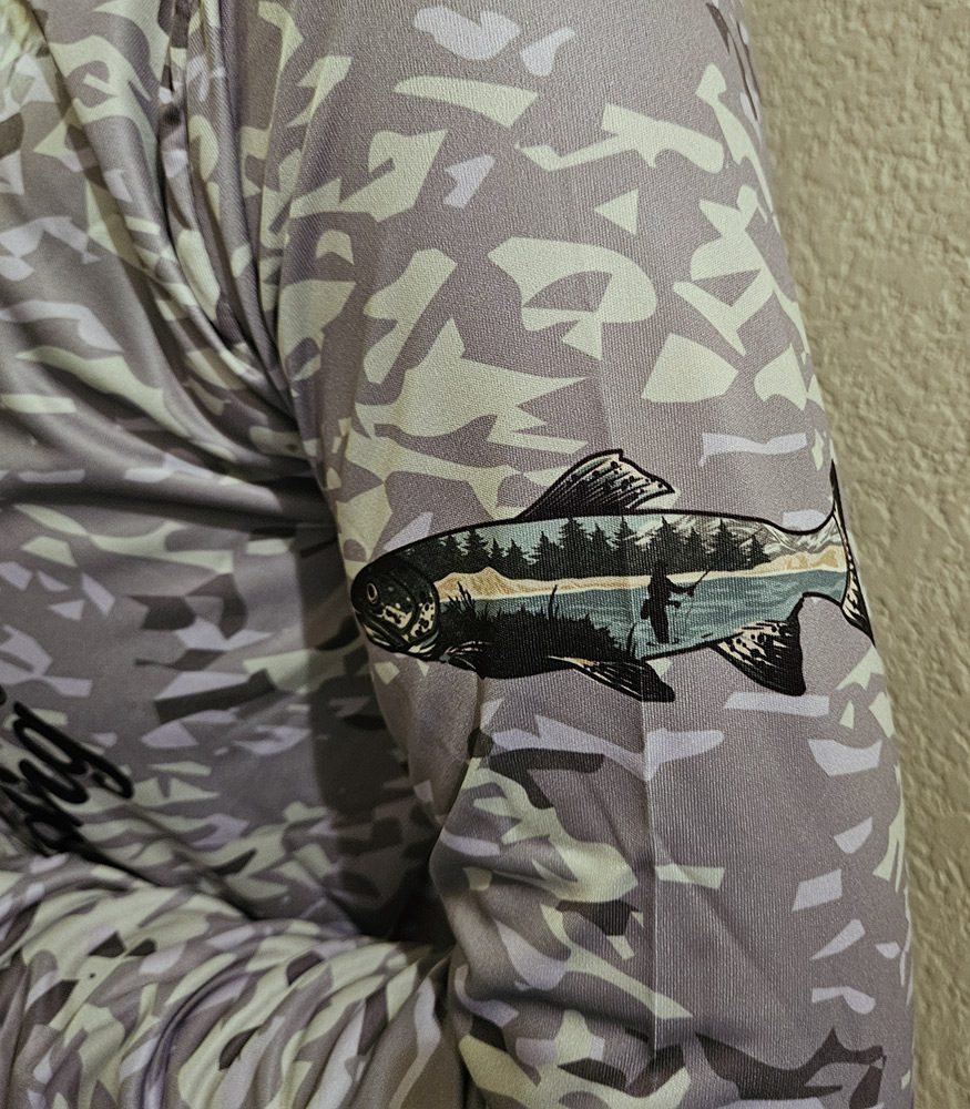 100% poly tech sun shirt hoodie with thumb holes to protect hands, front fly reel design sublimated and right sleeve logo. Women’s CAMO.